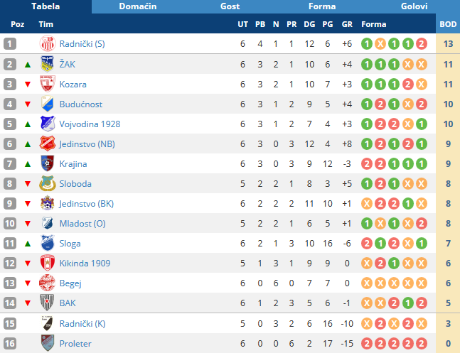 FK Sloga Plandište je trenutno na 11 mestu sa 7 bodova, dok prvi FK Radnički (Sutijeska) ima 13 bodova.
