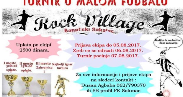Sad već tradicionalni turnir u malom fudbalu koji se održava u Banatskom Sokolcu, povodom seoske manifestacije Rock Village, počinje 07.08. (ponedeljak) i trajaće dva ili tri dana.